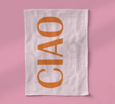 Dit levendige ontwerp bevat het woord "Ciao" in een vet retro-lettertype met felroze letters en een opvallende oranje omlijning.