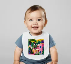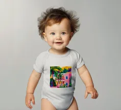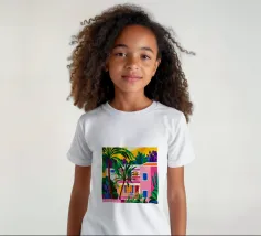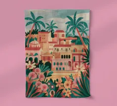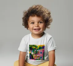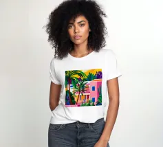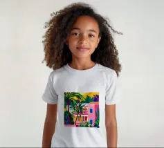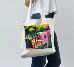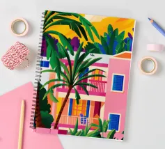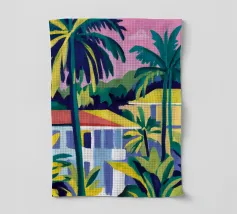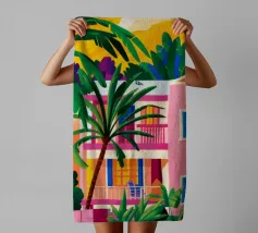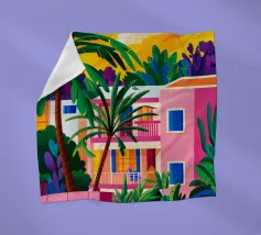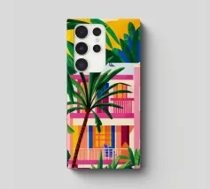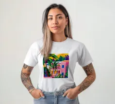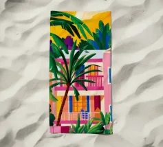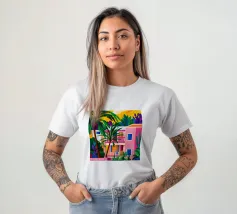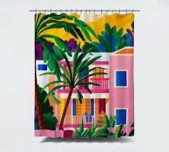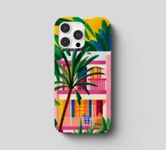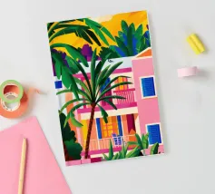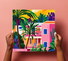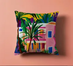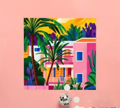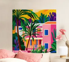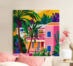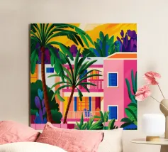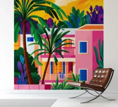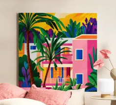 Een levendige en gedurfde illustratie van een felroze gevel van een gebouw, versierd met weelderige tropische planten en palmbomen. De scène is een explosie van kleur en leven en viert een maximalistische, tropische esthetiek.