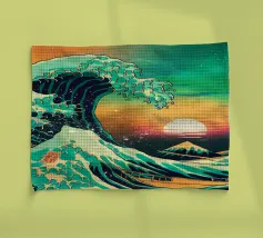 De afbeelding toont een gestileerde, zwart-wit illustratie van de Grote Golf bij Kanagawa, een beroemde Japanse houtsnede, met de Eiffeltoren bovenop de golf. De golf is afgebeeld in een dynamische, wervelende beweging, met schuimkoppen en een diepblauwe basis. De Eiffeltoren is hoog en slank en de ingewikkelde structuur contrasteert met de organische vorm van de golf.