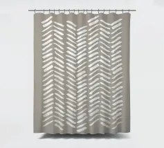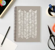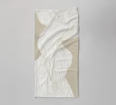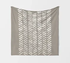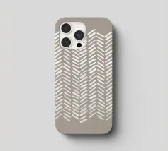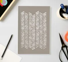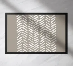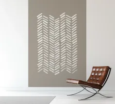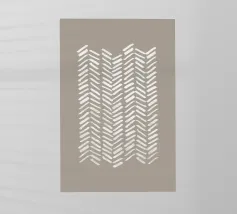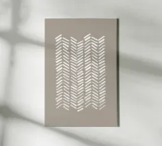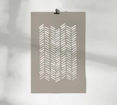 Modern abstract ontwerp met herhalende kolommen van witte, schuine lijnen in een chevron-achtig patroon tegen een beige achtergrond, waardoor een visueel opvallend en dynamisch effect ontstaat.