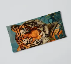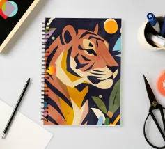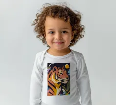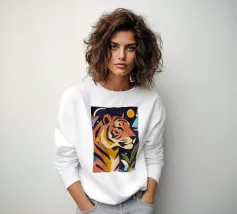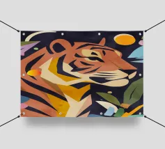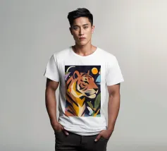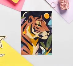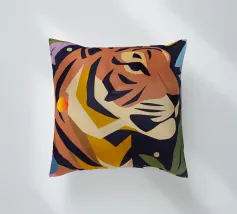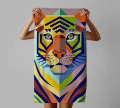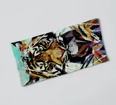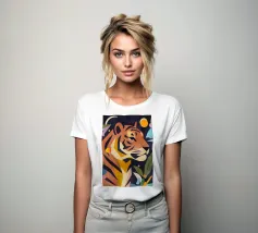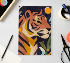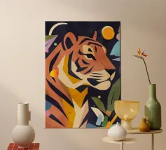 Een gestileerde tijger met abstracte kleuraccenten tegen een donkere achtergrond. Perfect voor creatieve natuurontwerpen, moderne dierenillustraties en artistieke projecten.Abstracte, krachtige tijger in een modern kleurenschema. Combinatie van natuurlijke kracht en artistieke stijl. Perfect voor creatieve projecten met een dieren- of natuurthema. Heldere oppervlakken, levendige kleuren en een sterke symboliek. Voor designliefhebbers, kunstliefhebbers en fans van dierenmotieven.