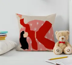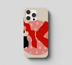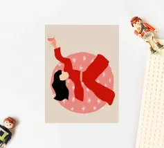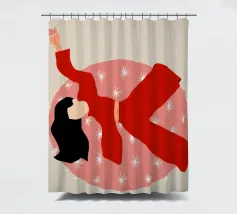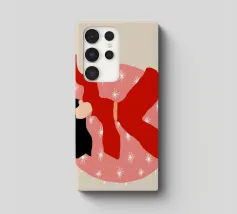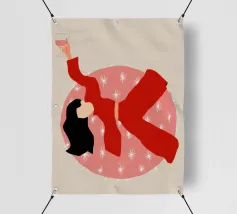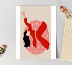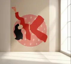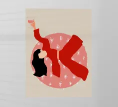 Een surrealistisch beeld toont een persoon en een zwarte kat die gewichtloos zweven in een rode cirkel, met een glas wijn in de hand, wat een hemels, droomachtig moment van pure rust suggereert.