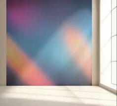 Zachte kleuren smelten samen in een dynamisch verloop op de achtergrond, met levendige roze, oranje en blauwe tinten die een abstracte visuele sfeer vol energie creëren.