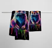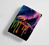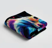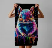 Een kleurrijke eekhoorn kijkt recht in de camera met grote, expressieve ogen. De illustratie maakt gebruik van een breed scala aan felle kleuren - waaronder blauw, roze, paars, rood en geel - waardoor de vacht levendig lijkt. Het kleurverloop is bijzonder opvallend, loopt van de oren naar de poten en eindigt in opvallende spatten en druppels van kleur. De achtergrond is diepzwart, wat de schitterende kleuren nog meer benadrukt en het motief een moderne, dynamische uitstraling geeft.