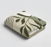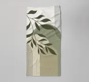 Een bladtak overlapt met geometrische vormen, waaronder gebogen lijnen en gelaagde, gedempte tinten. De combinatie creëert een harmonieuze mix van natuur en abstract ontwerp.