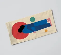 Een gestileerde abstracte compositie met overlappende vormen in levendige kleuren, die de indruk wekken van een zittend persoon. Het gedurfde gebruik van blauw, rood, oranje en groenblauw creëert een dynamisch gevoel van beweging en vorm.