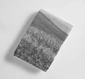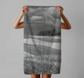 Zwart-wit beelden van een geoogst veld. De geometrische structuur contrasteert met de wolken.