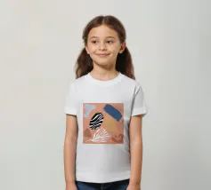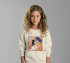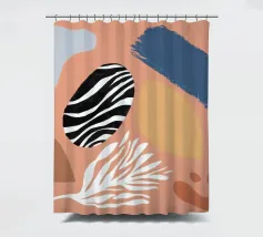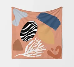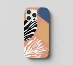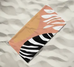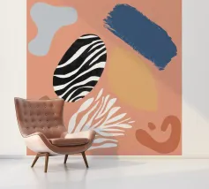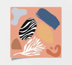Een hedendaags abstract kunstwerk dat verschillende texturen en vormen combineert. Een krachtige, blauwe penseelstreek contrasteert met een ovaal met zebrapatroon en zachte, organische bladvormen, waardoor een dynamische en tactiele compositie ontstaat.
