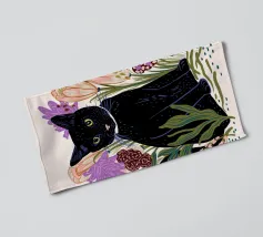 Een prachtig portret van een zwart-witte smoking kat met intense ogen, omlijst door levendige rode tulpen. Het kunstwerk is een opvallende en elegante viering van een geliefd huisdier.