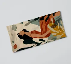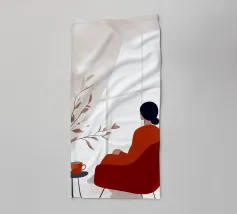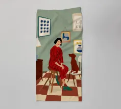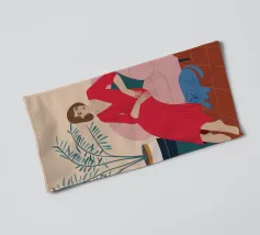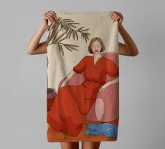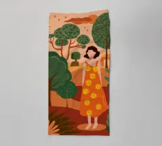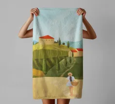 Een illustratie van een vrouw in een rode jurk, zittend in een veld met een olijfboom en een windmolen op de achtergrond. De scène is een serene, schilderachtige en tijdloze voorstelling van een vredige dag op het platteland.