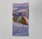 Een grimmig maar prachtig winterlandschap met als middelpunt twee prominente hooibergen die veerkrachtig in een uitgestrekt, besneeuwd veld staan, met in de verte een rij kale bomen onder een gedempte, bewolkte lucht.