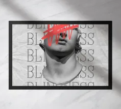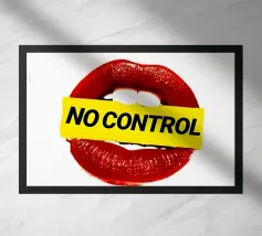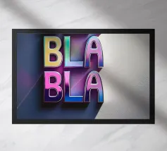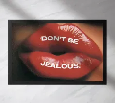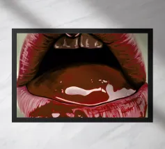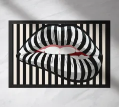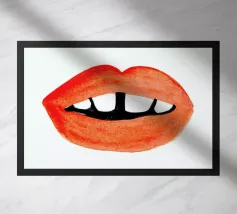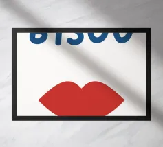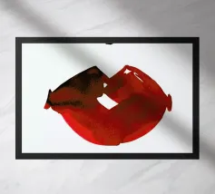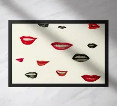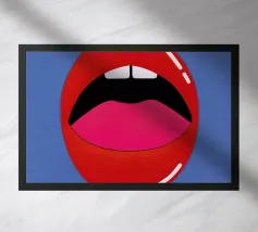 "Een paar glanzende, levendige rode lippen geplaatst tussen de woorden 'BLAH' verticaal gestapeld in vette, zwarte typografie tegen een strakke witte achtergrond, waardoor een speels en afwijzend statement ontstaat. Het contrast tussen de realistische lippen en de grafische tekst voegt een pop-art gevoel toe.",