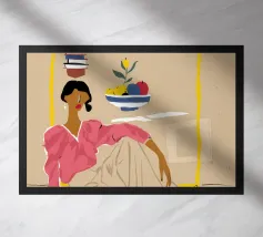 Een grillige illustratie van een kop dampende koffie in een blauw-wit geruit kopje, met gestileerde bloemen die erboven zweven, tegen een donkerblauwe, golvende achtergrond.