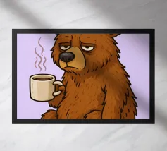 Een grillig paars monster met scherpe tanden, felgele ogen en een ondeugende grijns die een blauwe koffiemok vasthoudt. De speelse cartoonstijl voegt een leuke, eigenzinnige vibe toe die perfect is voor humoristische projecten of projecten met een cafeïnethema.