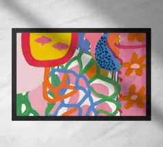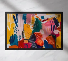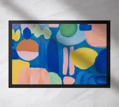 Een levendige en speelse abstracte compositie met een reeks organische, klodderachtige vormen in fel blauw, roze en geel. De spontane vormen en energieke kleuren creëren een gevoel van vreugdevolle artistieke expressie.