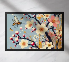 Het gedetailleerde ontwerp toont een verscheidenheid aan levendige bloemen die bezocht worden door bezige bijen.