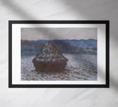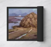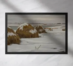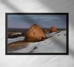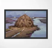Een landschapschilderij met een grote hooiberg in een veld in de buurt van een rustige rivier of waterlichaam. De lucht is gedempt, bewolkt grijs en het algehele palet is ingetogen met aardetinten.