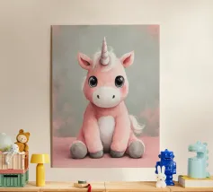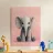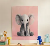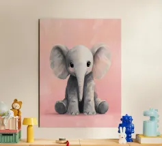 A peaceful baby elephant sits quietly, its large ears gently curved and its eyes full of innocence. Surrounded by a soft pink haze, the scene radiates warmth, tenderness, and a subtle touch of whimsy. Every brushstroke captures the calm spirit of childhood, where silence speaks and sweetness lingers.