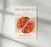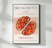 Set on a neutral, cream background, this elegant illustration of the famous Italian appetiser bruschetta adds sophistication to any kitchen, cafe or dining area. This minimalist yet informative design will spark conversation in any setting, adding a refined touch to your environment.