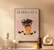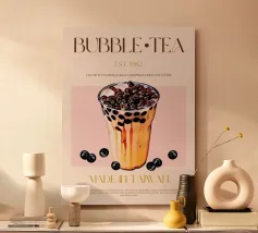 Set on a neutral, cream background, this elegant illustration of the famous bubble tea drink adds sophistication to any kitchen, cafe or dining area. This minimalist yet informative design will spark conversation in any setting, adding a refined touch to your environment.