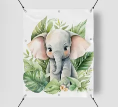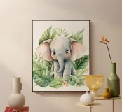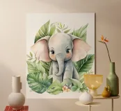 Jungle Baby Elephant" is an irresistibly cute and tender illustration featuring an adorable baby elephant peeking out from a lush backdrop of watercolor green leaves and foliage. Its large, soulful eyes and sweet expression capture the innocence of wildlife. The soft, gentle tones of the elephant's skin and the vibrant yet calming greens of the leaves create a serene and heartwarming scene. This charming artwork is perfect for nursery decor, children's books, or any project aiming to evoke a sense of wonder, nature, and endearing cuteness.
