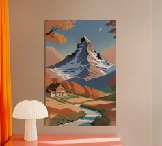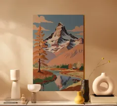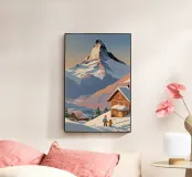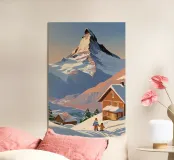 Immerse yourself in the peaceful beauty of the Matterhorn in winter. In this enchanting work, the snow-covered mountain landscape is brought to life with soft, pastel colours. Two figures, wrapped in warm winter clothing, enjoy the tranquillity of the snow-covered slopes. The majestic peak of the Matterhorn rises against a pastel-coloured sky, while the light of the sunrise bathes the landscape in a soft glow. This work of art conveys the magic of a quiet winter morning and invites you to immerse yourself in the tranquillity and vastness of nature.