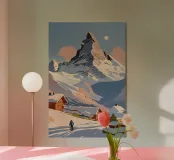 This impressive work of art captures the magic of the Matterhorn in winter. The majestic mountain towers proudly over a picturesque hut, surrounded by a carpet of snow that gives the landscape a calm, cool glow. The moon in the sky adds a serene atmosphere and emphasises the gentle stillness of a snowy winter landscape. Perfect for anyone who loves the beauty of the Alps and wants to bring the tranquillity of nature into their home. This poster is an eye-catcher for any wall and invites you to dream of snowy adventures.
