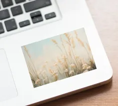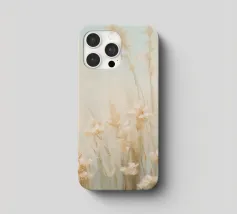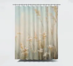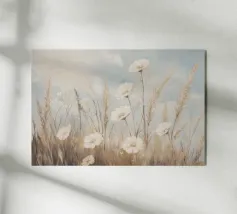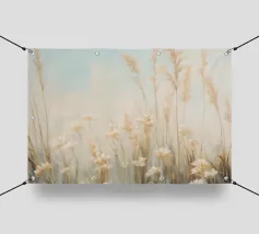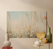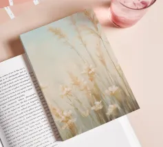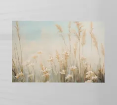 Soft, minimalist painting of golden wheat stalks against a pale foggy sky, creating a serene natural landscape.