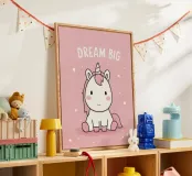 A tiny unicorn sits with wide eyes and rosy cheeks, its soft mane falling gently to the side. Above, the words “Dream Big” shine like a whispered wish among tiny stars. Wrapped in a bubblegum pink sky, this gentle scene speaks of hope, wonder, and the magic of believing in yourself.
