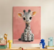 With her long neck gently curved and her bright eyes full of mischief, this little giraffe radiates playful innocence. Her tiny spots dance across soft grey fur, while oversized ears and tousled hair add a touch of wild charm. Set against a pastel pink background, she sits patiently—curious, calm, and irresistibly sweet.