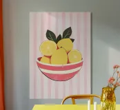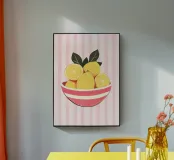 This delightful digital poster presents a whimsical take on a classic still life. A vibrant red-and-white striped bowl is filled with bright yellow lemons and dark green leaves, sitting against a background of soft pink and white vertical stripes. The artwork has a playful, slightly textured feel, like a hand-drawn illustration. The cheerful color palette and charming subject matter make this piece a perfect addition to a kitchen, dining room, or any space that needs a splash of sunny, happy art. This high-resolution digital download (7000x5000 pixels, 300 dpi) ensures crisp details and profes