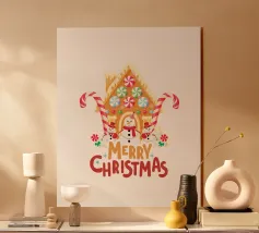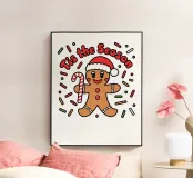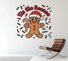 A cheerful gingerbread man wearing a Santa hat holds a candy cane, surrounded by festive sprinkles with the phrase "Tis the Season" above.