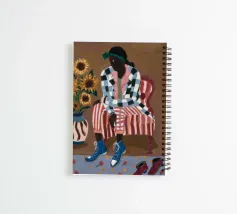 This artwork shows a person sitting on a striped chair, surrounded by sunflowers and a green bag. The background is a muted brown, creating a rustic and reflective atmosphere.