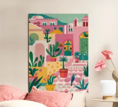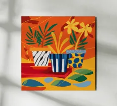 An abstract illustration shows a colorful staircase adorned with a variety of potted plants, blending architecture and botany in a vibrant, modern composition.