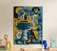 This vibrant and energetic abstract expressionist painting features a dynamic interplay of forms, colors, and textures, creating a sense of controlled chaos. Bold brushstrokes in blue, black, white, and orange dominate the canvas, with hints of yellow and green in the background. Recognizable elements, such as what appears to be a butterfly and fragmented facial features, emerge from the abstract composition, inviting multiple interpretations. This high-quality digital poster (7000x5000 pixels, 300 dpi) perfectly captures the raw emotion and spontaneous energy of abstract expressionism, making