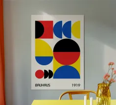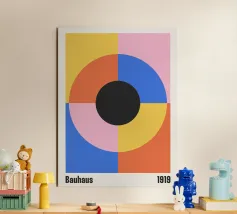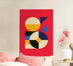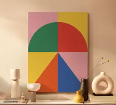 Inject vibrant energy into your space with this captivating abstract geometric art print. The design features a dynamic composition of bold color blocks and circles, creating a playful yet sophisticated visual. A large quadrant shape, split into yellow, red, blue, and hot pink, frames a central circular motif that mirrors these hues in its own divisions. This piece exudes a cheerful, contemporary vibe, perfect for adding a modern pop to any room. Produced at an impressive 7000x5000 pixels resolution and 300 dpi, this high-quality digital art ensures every crisp line and vivid color is rendered