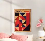 This bold abstract poster exemplifies the core principles of Bauhaus design—simplicity, functionality, and geometric purity. The composition is a dynamic mosaic of triangles and quarter-circles in a striking color palette of deep red, navy blue, and warm peach/apricot, creating an energetic and balanced pattern. The clean "BAUHAUS" lettering and a matching red bar are positioned at the top. This piece is perfect for adding a touch of sophisticated, retro-modern graphic art to any room. It is provided as a premium digital file (7000x5000 pixels, 300 dpi) ensuring a superior, high-definition pri