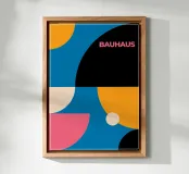 A visually arresting abstract poster celebrating the Bauhaus aesthetic with a vibrant, modern palette. The composition is dominated by large, overlapping circular and semi-circular forms in saturated colors: electric blue, bright orange, hot pink, and black. These shapes create an intricate, dynamic negative space against a light background. The word "BAUHAUS" is prominently placed in hot pink in the upper right black section. This artwork is a pure expression of geometric abstraction and modernist principles. The high-resolution digital format (7000x5000 pixels, 300 dpi) ensures exceptional p