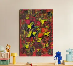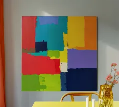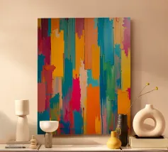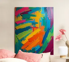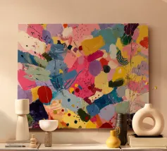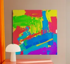 Vivid colors blend together in dynamic shapes, creating a joyful and energetic composition. The assortment of hues offers a striking visual experience filled with movement.