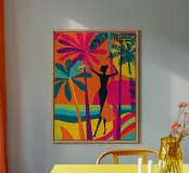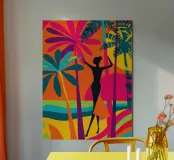 This work transports you to a Californian Art Deco paradise: A slender, elegant, female silhouette dances beneath stylised beach palms, framed by a kaleidoscope of psychedelically bright colours and shapes. It celebrates the carefree, feather-light aesthetic of the American West Coast and geometric precision. A timeless piece that radiates pure joie de vivre and nostalgic glamour - perfect for adding a dose of tropical elegance to any room.