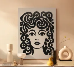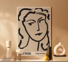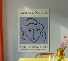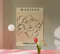 Timeless elegance in the purest line: this "CONTOUR 2025 PARIS" exhibition poster celebrates the art of minimalist portrait drawing. The flowing ink lines and playful curls are immediately reminiscent of Matisse's legendary lithographs of the 1940s. The monochrome colour scheme on warm beige underlines the classic aesthetic. Every stroke is perfect - pure economy of means with maximum expressiveness. The subtitle "en dialogue avec Matisse" promises an inspiring exploration of the master of the line. For lovers of minimalist portraits.