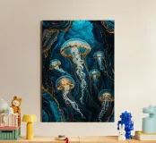 In an underwater realm of sapphire and gold, luminous jellyfish drift gracefully. Their delicate forms shimmer with golden accents, a celestial dance of light and serenity in the ocean's depths.