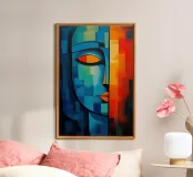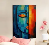 This cubist-inspired and emotionally moving esoteric composition splits the female face into two worlds: The left half sinks into icy blue tones, while hot orange and red tones blaze on the right. The geometric fragmentation is reminiscent of Picasso's cubism, but the vibrant colour palette and impasto brushwork lend the work contemporary power. The almond-shaped eye - at once a window and an enigma - hypnotically fixes the viewer. A haunting meditation on inner contrasts, duality and the complexity of human identity.
