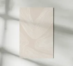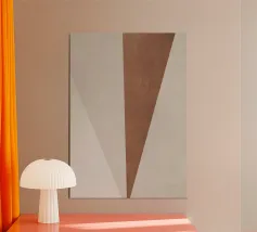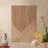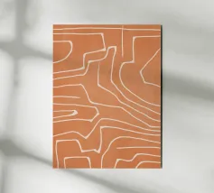 Striking geometric design featuring white parallel lines arranged in various orientations, creating triangular and trapezoidal shapes against a brown background, resembling a wooden texture.