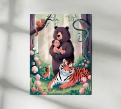 This artwork depicts a grumpy-looking cloud with a thought bubble containing a bird and a bear. The humorous and imaginative scene is set against a soft blue background.