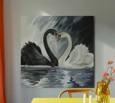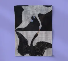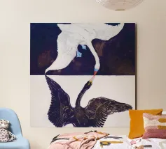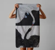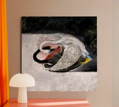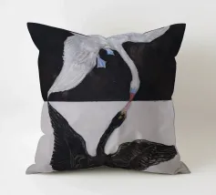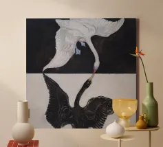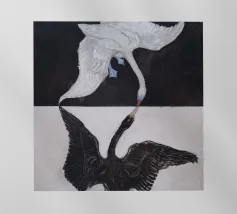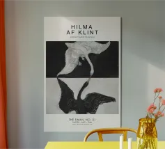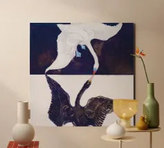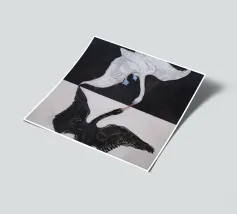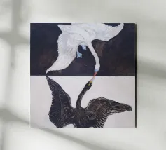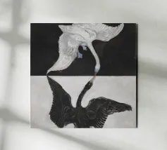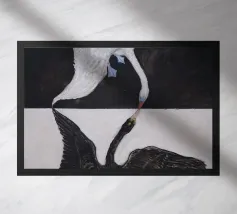 Experience the striking duality and profound unity in Hilma af Klint's "Group IX-SUW, The Swan, No. 1" (1915). This iconic abstract work masterfully depicts a white swan and a black swan mirrored, their beaks touching, against a stark black and white divided background. It symbolizes the harmonious balance of opposing forces and spiritual connection. Klint's pioneering role in abstract art is powerfully conveyed through her symbolic composition and bold use of contrast. Our premium digital poster, rendered at a stunning 7000x5000 pixels and 300 dpi, impeccably reproduces every intricate detail