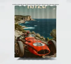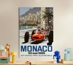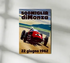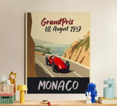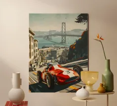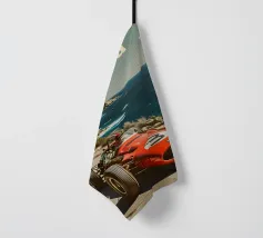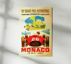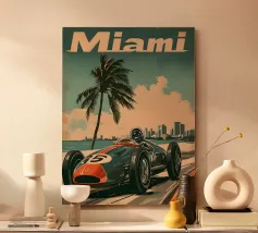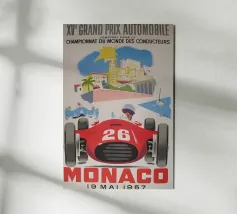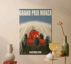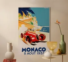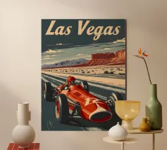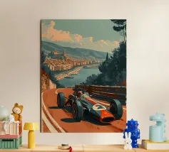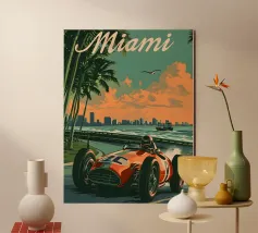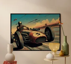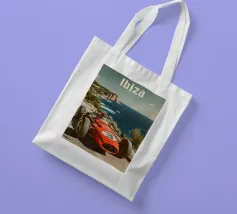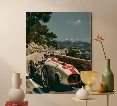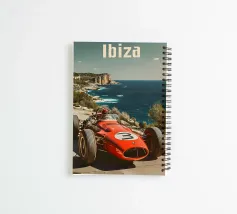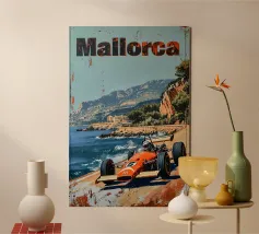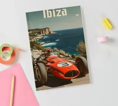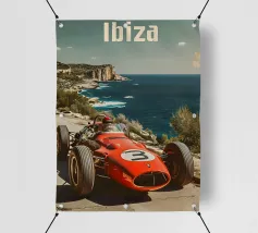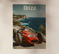 This dynamic vintage poster shows a classic racing car travelling along the winding coastal roads of Ibiza. Surrounded by a Mediterranean landscape with pine trees and blue sea in the background, the design conveys speed and freedom in a timeless retro style. Warm, sunny colours and subtle textures give the poster a nostalgic flair and capture the exciting racing feeling of the 1950s and 60s on the Balearic island. Ideal for fans of motorsport, vintage cars and the Mediterranean lifestyle.