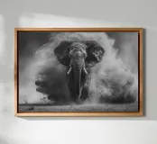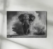 A mighty African elephant runs through the dusty savannah - every movement stirs up the earth and fills the air with dynamism. The large-format, monochrome photograph impressively captures the raw power and beauty of this wild moment.