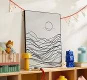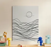 Curved black lines create an abstract landscape against a light background, with a simple circle suggesting a sun or moon above. The composition evokes a sense of calm and simplicity with its minimalist design
