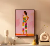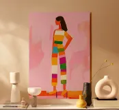 A vibrant and stylized figure dominates this bold illustration, rendered in a striking Maximalist Pop Art style. The subject, a woman with dark hair, stands confidently in a multi-colored, patchwork jumpsuit or co-ord set. Her clothing is composed of horizontal blocks of color—orange, white, yellow, green, teal, and magenta—with an emerald green belt cinching the waist. The background is a soft, textured bubblegum pink with broad, vertical brushstrokes, contrasting beautifully with the figure's sharp lines and saturated hues. This piece captures a bold, joyous fashion moment, perfect for Dopam